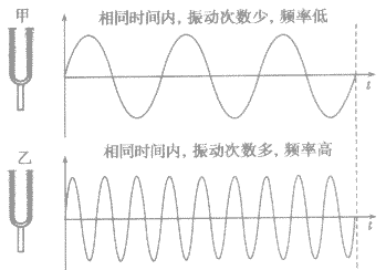 (3)用波形比较频率:如图所示,甲、乙两个音叉的频率不同。在同样时间内,甲振动次数少,频率低,音调低;乙振动次数多,频率高,音调高。