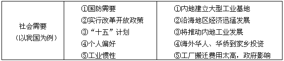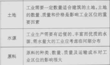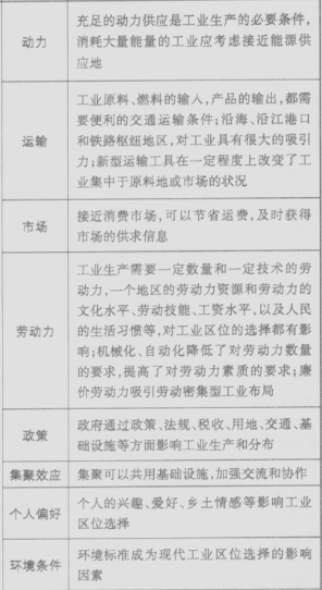 主要因素:原料、动力(燃料)、劳动力、市场、交通运输、土地、水源、政府。