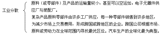 | 表现 | 体积小、重量轻、价格昂贵的零部件生产企业与产品组装工厂之间可以相距较远;产品结构复杂、零部件种类繁多的复杂产品生产,其各种零部件生产厂家也可以分布在许多地方,甚至形成跨地区、跨国企业。 |
