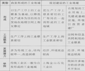 | 发展条件 | 钢铁工业、石化工业、机械工业等生产过程复杂,其内部的工业联系比较复杂,形成的工业地域面积大,协作企业多,生产规模大,发育程度高 | 主要依靠当地的自然资源和农产品,发展初步的加工工业,这样形成的工业地城,工业联系简单,规模小,工厂少,发育程度低 |