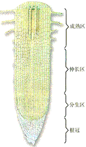 根尖结构:根冠、分生区、伸长区、成熟区(根吸收水分和无机盐的主要部位)