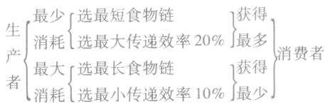 4.已知较低营养级生物的能量求解较高营养级生物的能量时,若求解“最多”值,则说明较低营养级的能量按“最高”效率传递;若求解“最(至)少”值,则说明较低营养级生物的能量按“最低”效率传递。具体规律如下: